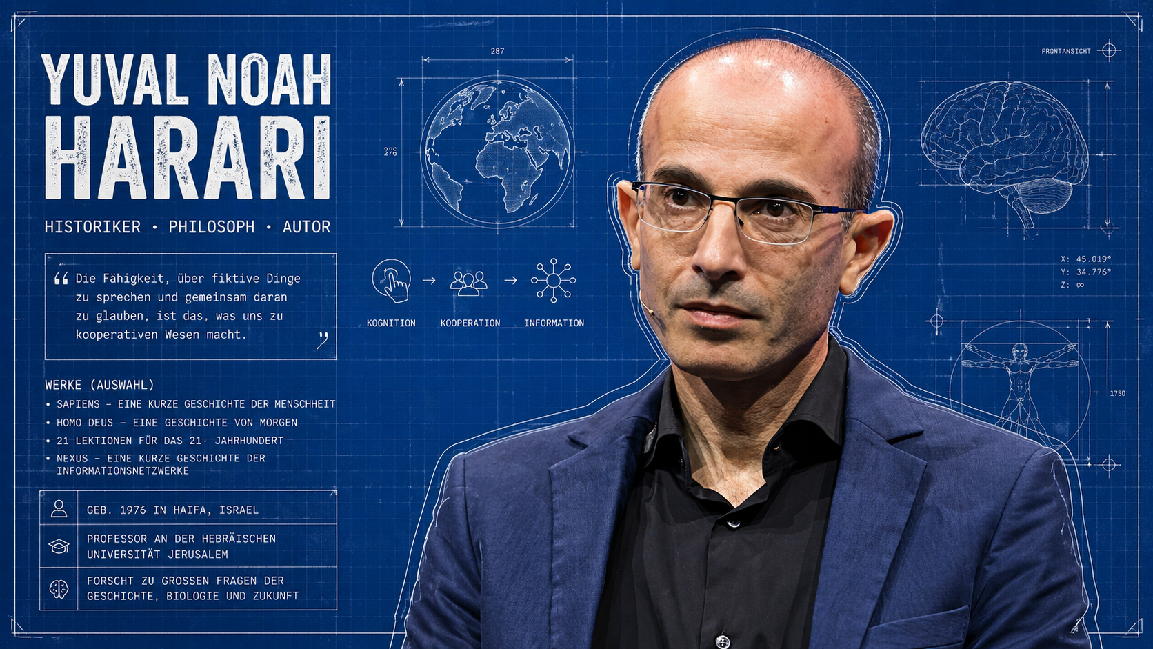 Yuval Noah Harari, geboren 1976 in Israel, hat mit einem einzigen Buch die Art verändert, wie Millionen Menschen über ihre eigene Spezies nachdenken. In Sapiens (2011) formuliert er eine These, die so einfach ist wie radikal: Der Mensch dominiert die Erde nicht, weil er stärker oder schneller ist als andere Tiere. Er dominiert sie, weil er an Dinge glauben kann, die nicht existieren.